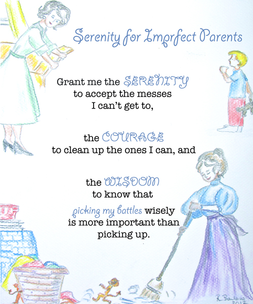 Grant me the Serenity to accept the messes I can’t get to, the Courage to clean up the ones I can, and the Wisdom to remember that Picking My Battles is more important than picking up.