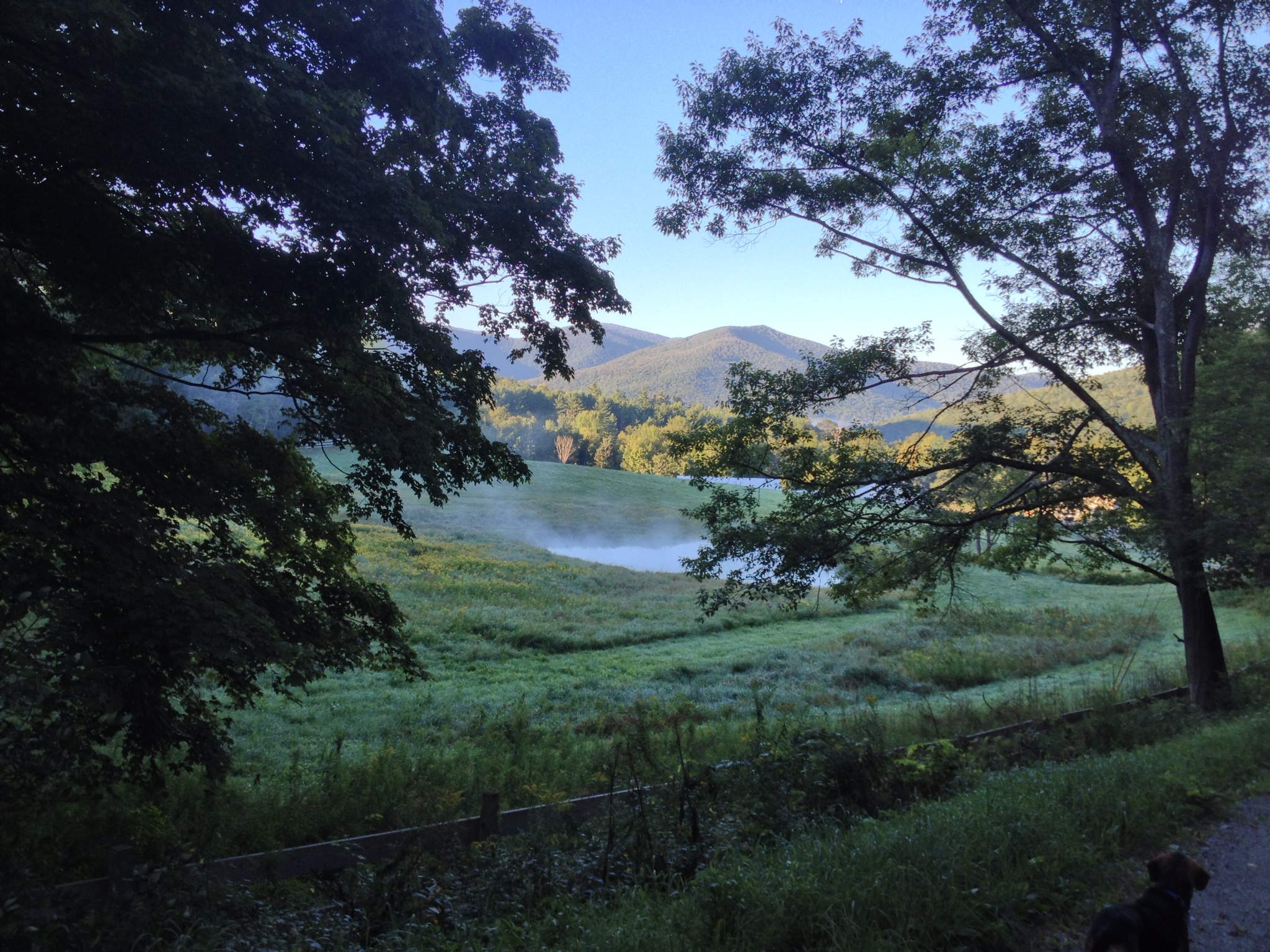 We have another day of intense cleaning ahead of us, so I rose early for a little walking and writing time. Katy has already reset her body clock for a six a.m. walk, and was close at my heels as I trudged from bed to bathroom. It wasn't until we climbed the hill of our driveway that I began to wake up, but as we started down the hill to the horse farm, the scene that greeted us breathed the day right into me.