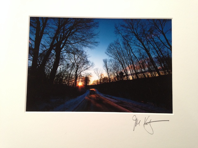 Jon is offering a beautiful landscape photograph called Morning Road, matted to 11 x 14. Jon, the bestselling author of 22 books including his recently-released Second Chance Dog is also a gifted photographer. He will be showing some of his work in a joint show with the legendary George Forss in February.