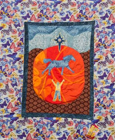 Maria’s offering for March is making this Common Thread’s artist wish she could be in the running. This 50″ by 60″ fleece blanket is a replica of a quilt she made for Blue Star Equiculture, a Working Horse Sanctuary. Maria described the design as a symbol of the ancient bond between people and horses and the importance of keeping that relationship alive. The proceeds of the sales of these “Restore-the-Bond” blankets were given to support the horses at the Blue Star Sanctuary and horses around the country, and this month the lucky winner of the Common-Thread Give-Away Drawing will receive one of these special blankets!