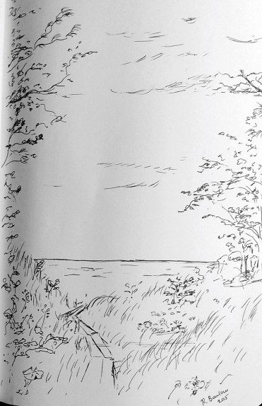 Sunday night was marked by a violent storm that came over the lake with a tornado warning to wake us from any reveries we might have slipped into too early in our vacation. I knew upcoming plane travel combined with my commitment to carry-ons only would necessitate stripping down the art supplies to the bare essentials, but I think my little Pentalic and my ball-point pen will be ample for 10 days.