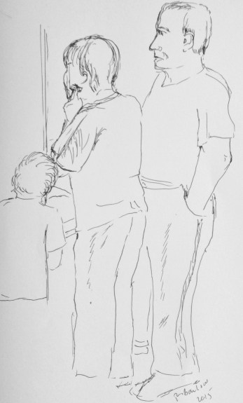 Monday was full of firsts. First plane ride for T1 and T2. First tornado warning of the season. And first shave for Thing1, just a few days shy of his fifteenth birthday. I managed not to get the sketchbook too soaked.