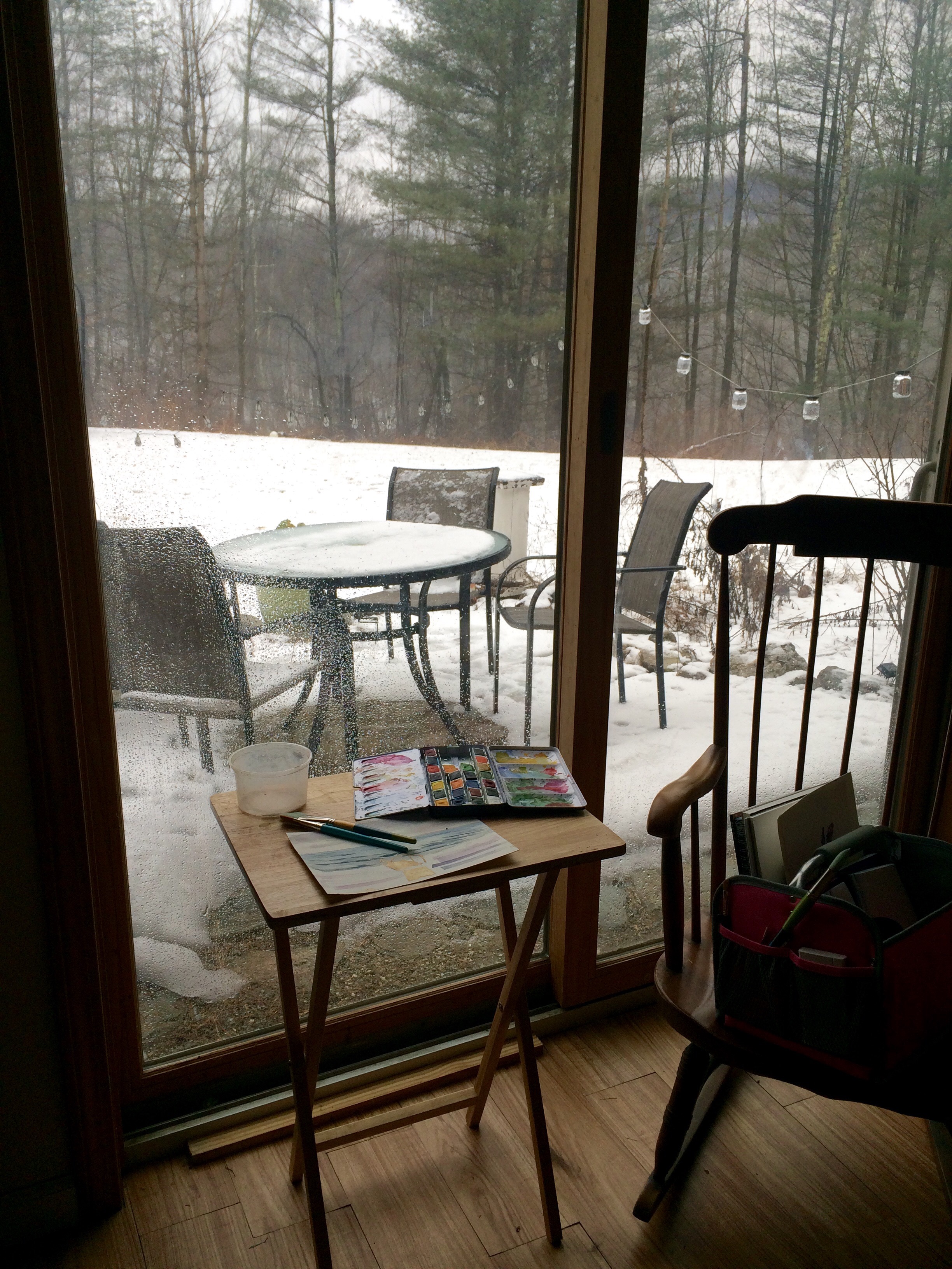 Thing 2 had already invited a friend over for a play date, and we decided friend should still come. We had mostly dried our tears by the time the friend arrived, and we chatted with his father for a while as I disassembled our Christmas tree. I set up my TV tray in painting gear near the now-empty space in front of the window thinking how quickly the holiday season come and gone.