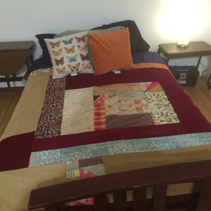 The one exception to this accident is the quilt on the bed. It’s Maria Wulf creation. She posted on her website as she was making it, and I just knew I had to have it. It wasn’t rational, but knew it was mine. Looking at it on a bed duct out with four different colors of sheets pillowcase and throw pillows, I realize it was a perfectly rational choice.