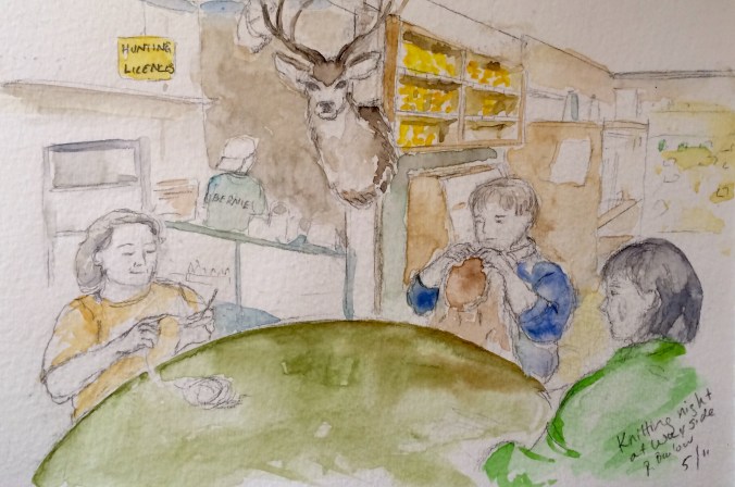 The last month or so the Wayside just tried something new–a knitting night. A few men have joined the knitting group, but most of the nights that I walk in on the circle at the back of the store, it’s occupied by Lady KNights taking a break from worlds problems.
