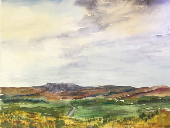 I found myself painting this a few times in my watercolor journal and again when I got home, and the results were always similar. The paintings were never faithful copied of my photographs but, rather interpretations of the vivid beauty and vastness of land that had been ravaged but then recovered.
