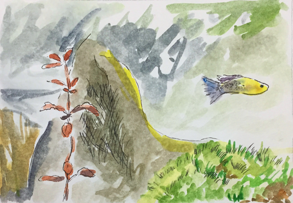 I turned to my fish tank and set the timer. My guppy, Oscar seemed to know he was being drawn because he chose those exact three minutes to do his daily race around the fake bonzai plant, but three minutes later I had a fishy doodle.