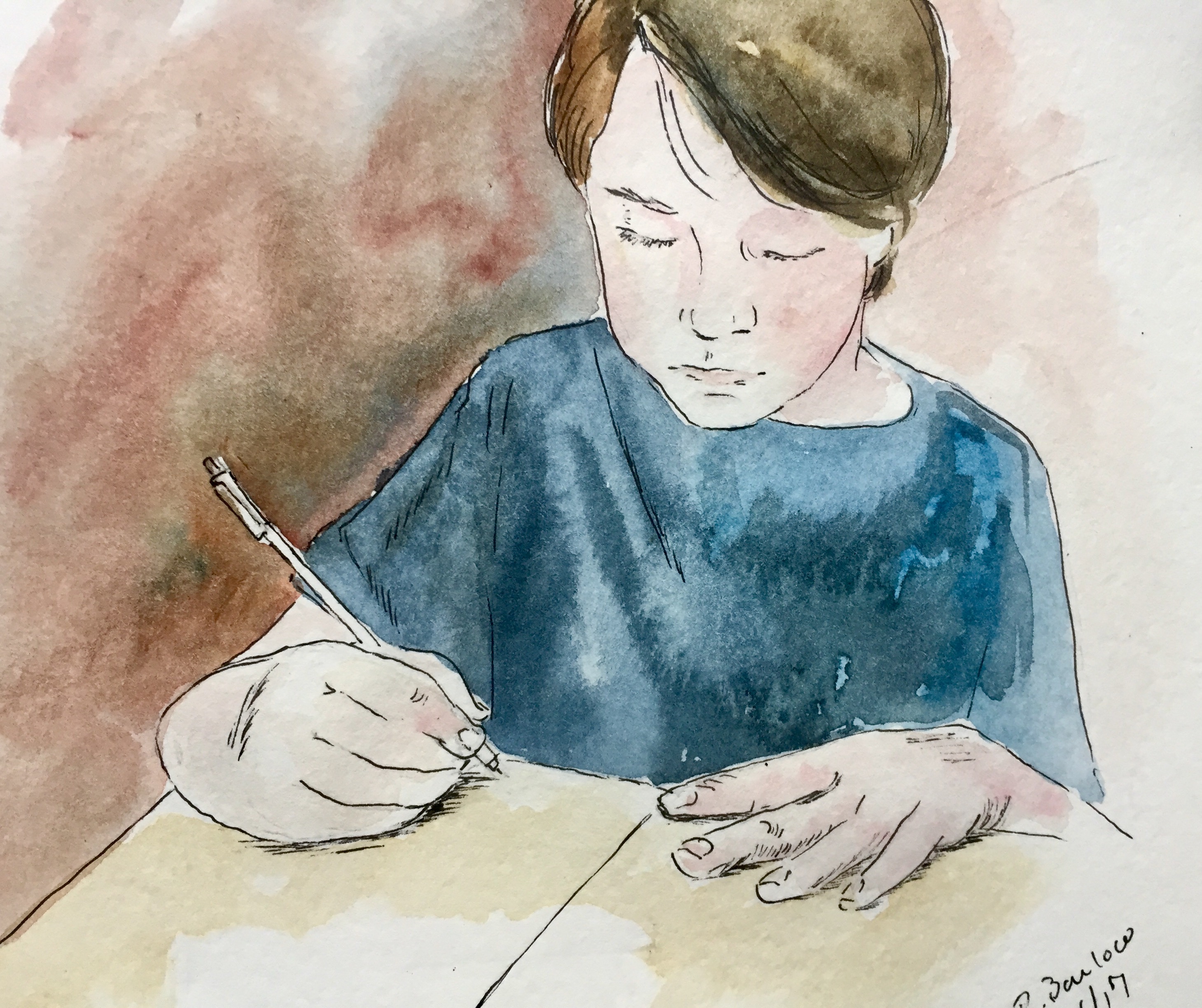 Right on cue — as he does at every art museum or any time I’m sketching on the road — T2 asked if I had an extra journal. For once, i had thought to pack an extra, and the two of us sketched together in silence until our food arrived.