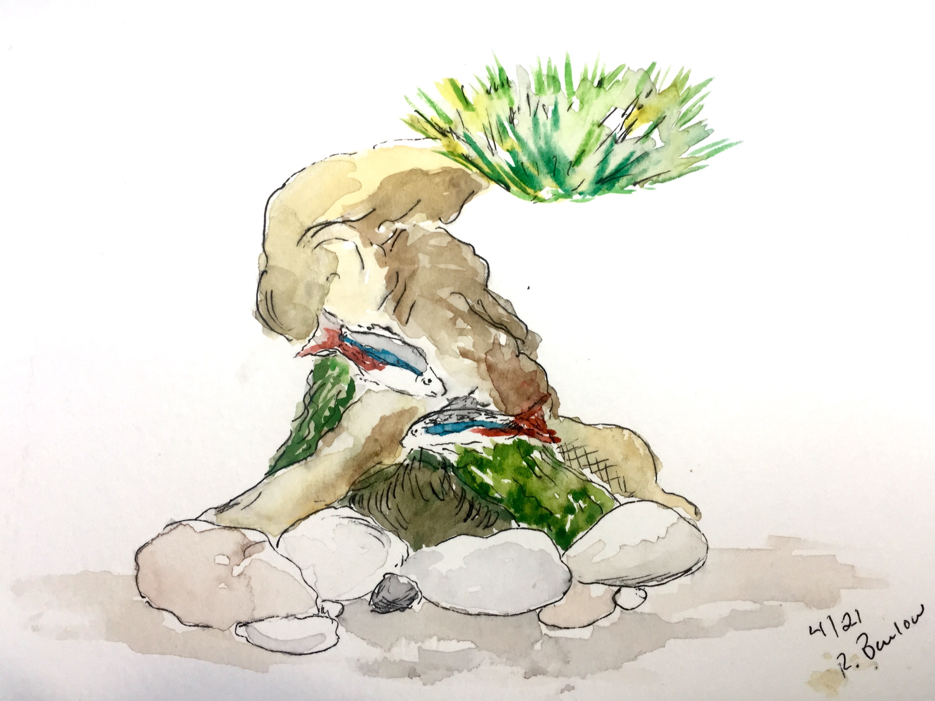 So Herman the Hermit was discovering his own beauty in the reflective surface of the aquarium, Oscar the Guppy was hiding among the purple plant leaves (apparently nursing some slight from the minions), and yours truly had only enough time for one 3-minute timed drawing.