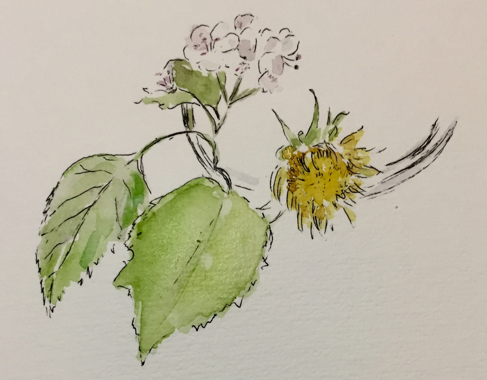 I know they’re weeds, and I probably won’t be so philosophical when I’m yanking them out of the garden next month, but right now, after a long rainy spring, they’re a lot more than weeds. They’re miniature sunflowers.