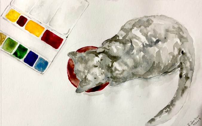 Calamity Jane jumped up on the table as I dipped a brush in my fifty-cent plastic water tumbler. She sniffed my forehead and then gave me a silent meow as she gracefully inspected the tumbler and the pan of paints. Then she bent over the illustration as if she was evaluating it.