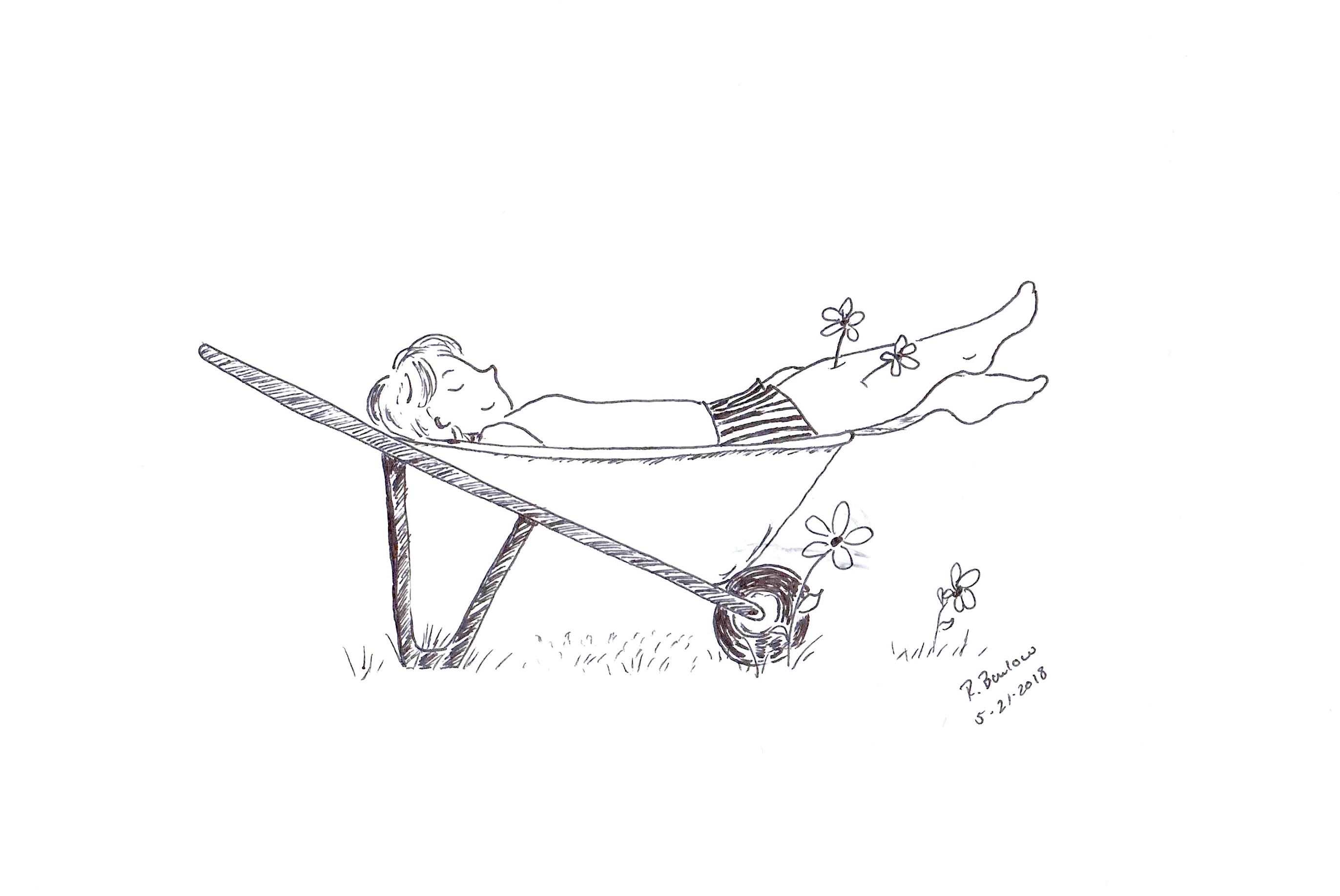 I’m ridiculously out of shape, my belly resembling the shape of the more bulging clouds. I want to get the earth cleared so he can start after the rain, so I keep shoveling and rolling. As I’m pushing load number 14 to the edge of the woods, though, I push pause.