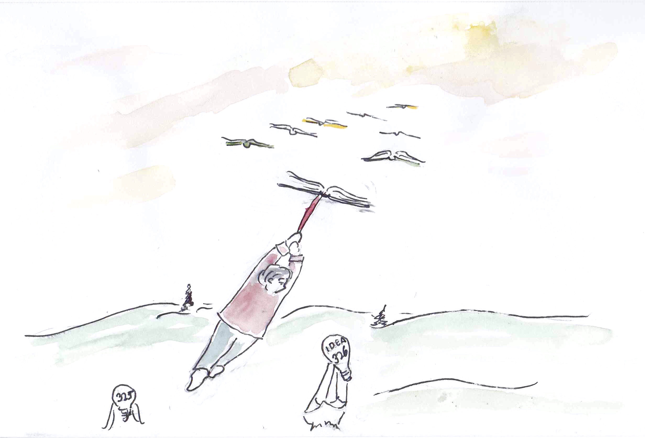 The words ‘I have an idea’ can strike fear into the hearts of husbands and resignation into mentors. My sun-singed ideas languish in half-filled notebooks and devices. An almost-finished children’s book marinates on my iPad as I view yet another video on how to write children’s books. Another waits to move from the rough sketch book to the painting table. The pages of still another non-fiction book have started forming. Meanwhile, I’m still trying to explode into the sky and catch every idea for a novel or comic book that flutters chaotically over the fields and mountains, often following their trajectory until I’m blinded.