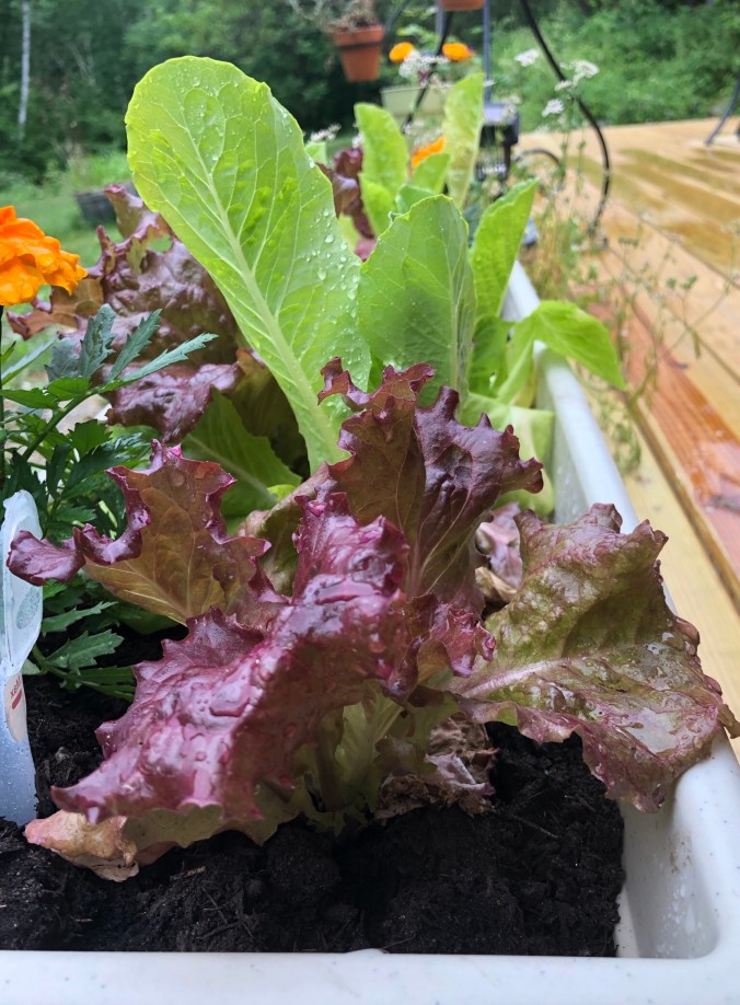 Five minutes after the deck was finished, I started filling my mismatched collection of planters with green. Still a vegetable-tatiana, the planters now nurture tomatoes, cucumbers and salad greens. We may not get much actual food from our mini kitchen garden, but the cucumber tendrils wrapping around a trellis and the tiny ruffled row of lettuce is making a growing sculpture gallery. Thing1 helps himself to a few leaves of lettuce for his sandwiches each day, but for me, the garden is a feast for the soul.