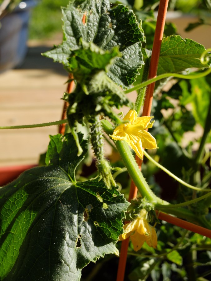 The first spiky baby cukes appeared today. The cherry tomato plant next to it is sporting a few green ornaments.