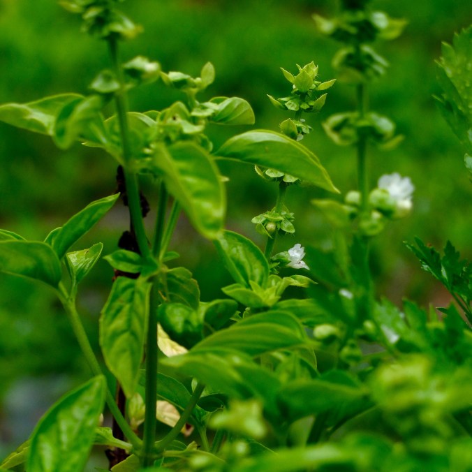 I love the lush greens that come out when the world is wet. The little white flowers appearing on my basil make the greens pop even more, but they’re also a warning that the basil’s getting ready to bolt. It’s not alone.