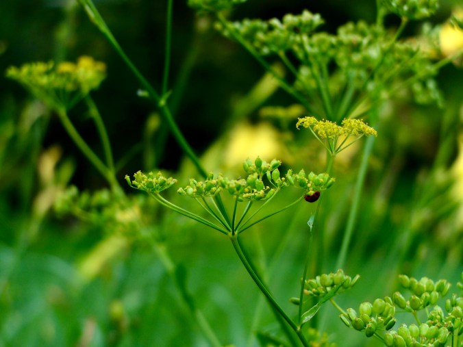 Ladybugs are amazing little creatures. Somehow they can crawl all over the blooms of Wild Parsnip that have emerged on the borders of our yard and don’t seem any the worse for it.