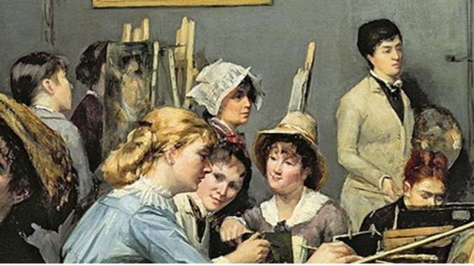 I expected to see mostly Cassatt and a few lesser-known impressionists, and they were represented in the collection. The wonderful surprise, however, was the breath of work hanging in the basement gallery of the museum. In an era when most women led hidden lives, the 19 or so artists represented in the gallery had worked within and against the salon system, had painted impressionistic views of family life, amazing examples of classical realism, and covered subjects as wide ranging as still life tea sets to great historic events. Some women had the support of their husbands or families, but many had to go against the grain just to acquire the training they wanted. Some had to get permission to wear men’s clothing in public so that it would be safe for them to paint plein air. They had to get permission to join classes for life studies and to create content outside the domestic sphere. Absent family support, many of these women found encouragement from mentors and frequently from fellow female students sharing the same creative boat.