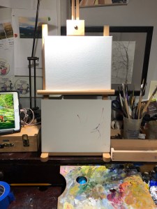 I’ve been using an old table easel that had a drawer built into it. It was great for hauling my plastic cups full of brushes and pencils, but was kind of a pain when it came to working on smaller canvases.