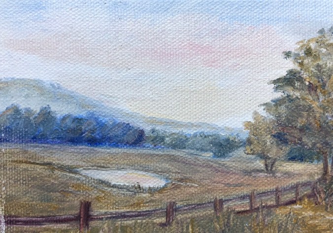 The prescription is starting to tackle some of the symptoms, but faced with arms that are too tired and shaky to do much work at the large easel, I taped one of my tiny canvases to a pallet and Turned painting into physical therapy. I like the tiny canvases. They use a lot less paint and strength.