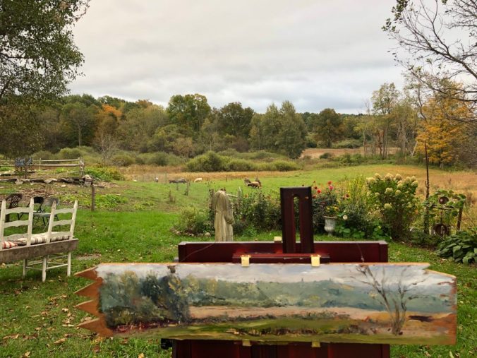 I took a two hour break from my day job today to do a demo painting over at the open house at Bedlam Farm hosted by author Jon Katz and Fiber Artist Maria Wulf in Cambridge. The open house was already in full swing past the time I got there. Some people were watching a sheep herding with Jon’s dog Red, while others browses Maria’s Gallery, shopping for art by one of the ten or twelve artists she’s brought together for this event.