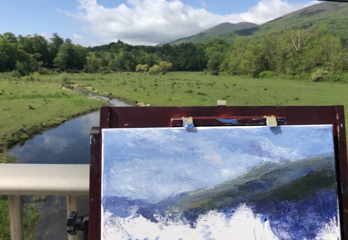 I am standing at the bridge that divides our town park from a cow meadow, chasing the clouds with my brush and palette knife, listening to the bells calling from the nearby Episcopal church, and remembering why I have been studying for over a year to make so many things — but especially this — possible. A few cars go by, the birds are putting on a concert, and I feel as if I have really entered the world for the first time in a very long time.