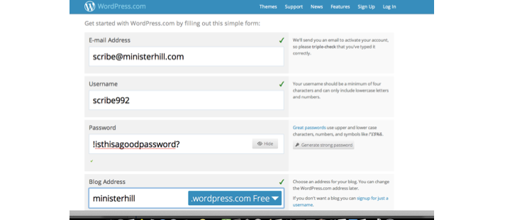 You’ll be prompted to choose a User Name and enter your email and a password. WordPress will automatically try to name your blog after your User Name, but you can change this to anything you like, as long as it’s available: