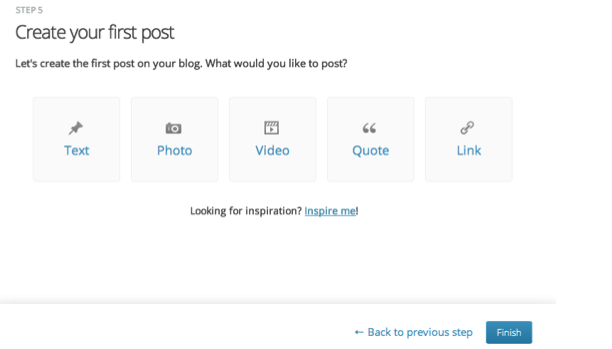 6. Create your First Post – Once you’ve connected your social networks (or if you choose not to), you can click ‘Next Step’ to begin posting. Click on the appropriate button to begin creating your first post. You can choose from to start a new text, image, video, or link-based post. WordPress will help you format images or enter a link. :