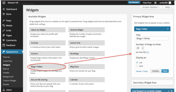 In addition to themes, WordPress offers tools called ‘Widgets’, found under the Appearance tab. Widgets let you click and drag items to your blog’s side bar: