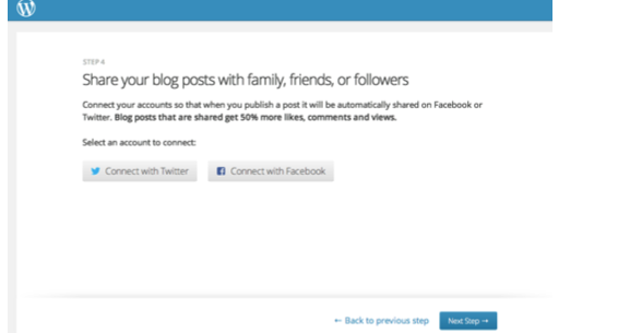 5. Connect your Social Networks – If you have a Twitter or Facebook account, this next step will let you connect your blog to those accounts. This will let you automatically share your posts with your friends, helping build your traffic effortlessly.
