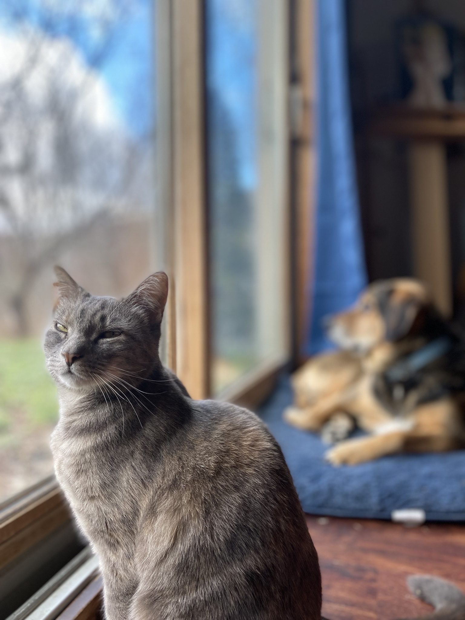 Katy and Jane are BFFs, but Katy is suspicious of Jim whenever he approaches her bed. The first time they met, he swatted her on the nose. He goes out of his way to bully her out of food and sleeping spots. But this morning, still hung over from his wandering, he just sniffed. Then he butted the soft part of his head against her face and hopped back on the bed.