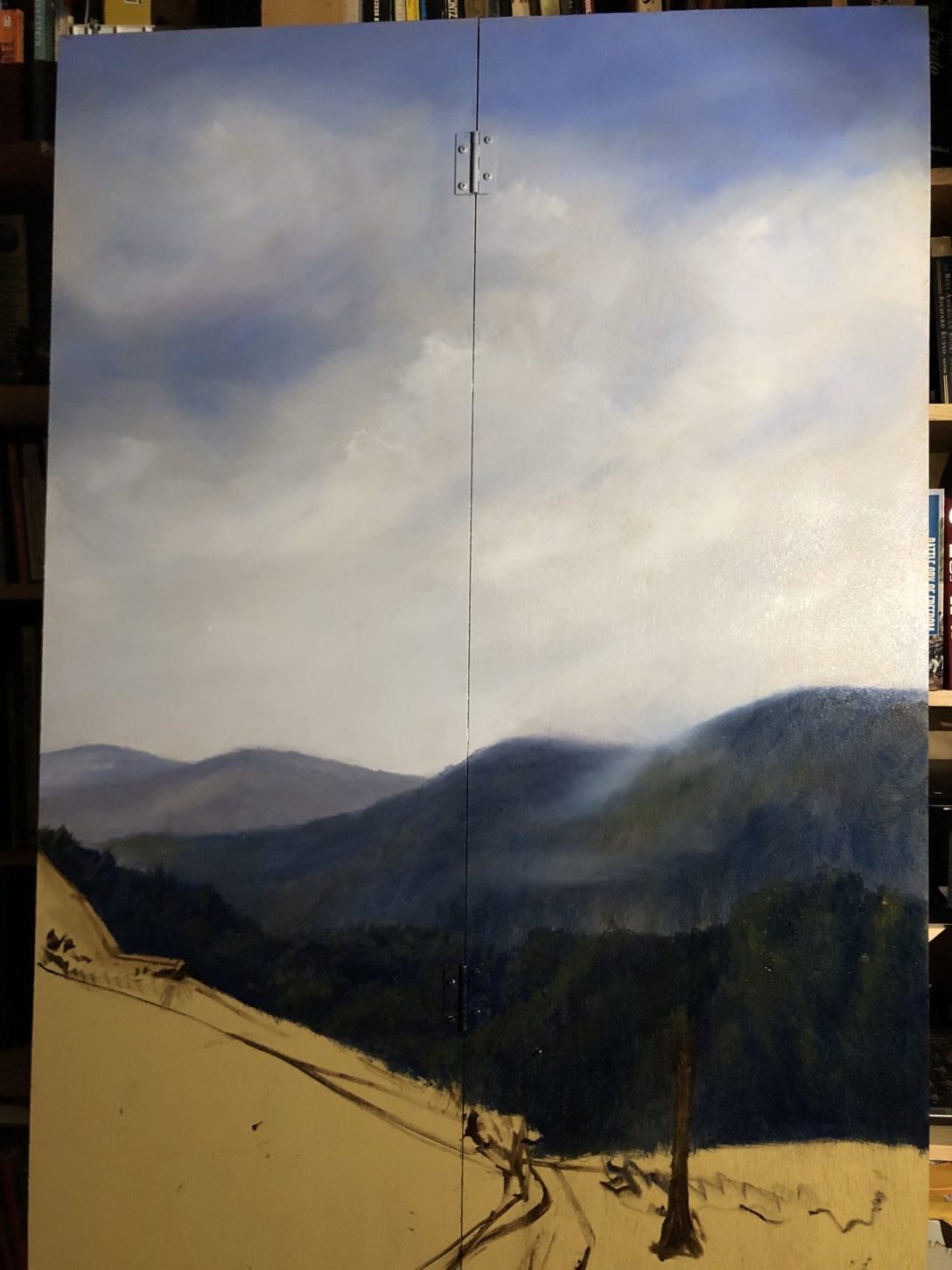 Painting the bifold doors is giving me a chance to get a new take on an old scene. The original of this scene was an 8×10 that’s found another home, and it’s turning into even more fun now that my little dirt road is looking like big sky country ( about 4 feet by 3 ft so far).