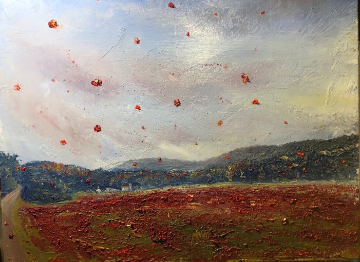 It wasn’t until I was back from my errands, meditating on a painting of our road that I realized that the funny feeling I can’t put my finger on is relief. there still a bit of fear affecting my aim, fear but things could backtrack. for now, though, it’s enough to be able to meditate on canvas and, even if I can’t put my finger on it, meditate as the anxiety begins to melt away.